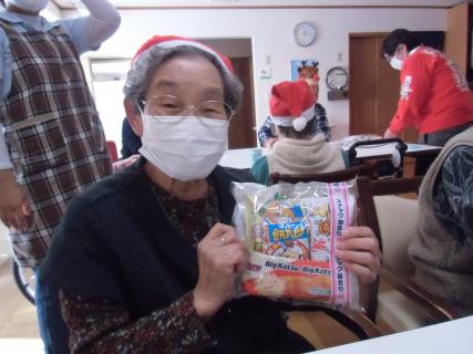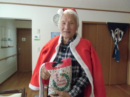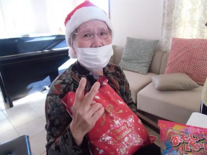 サンタレディ&利用者様によるサンタクロースからプレゼントを手渡され、